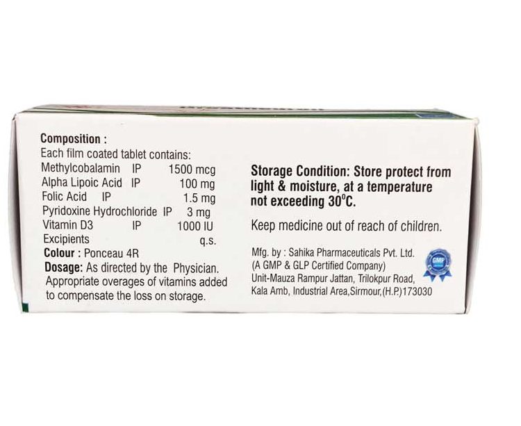 GREATNEURON (Methylcobalamin 1500 mcg, ALA 100 mg, Folic Acid 1.5 mg, Pyridoxine 3mg & Vitamin D3 1000 IU) is the active, coenzyme form of Vitamin B12. Unlike other forms like cyanocobalamin, it is bioactive and can be used directly by the body without conversion, making it highly effective for treating deficiencies and neurological issues.